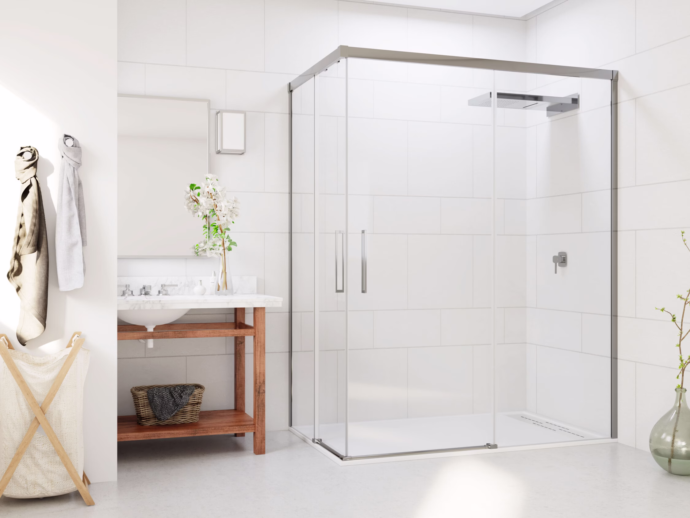 Transforme el baño en un oasis de lujo con nuestra Mampara Angular Corredera 2 Hojas Correderas + 2 Fijas.