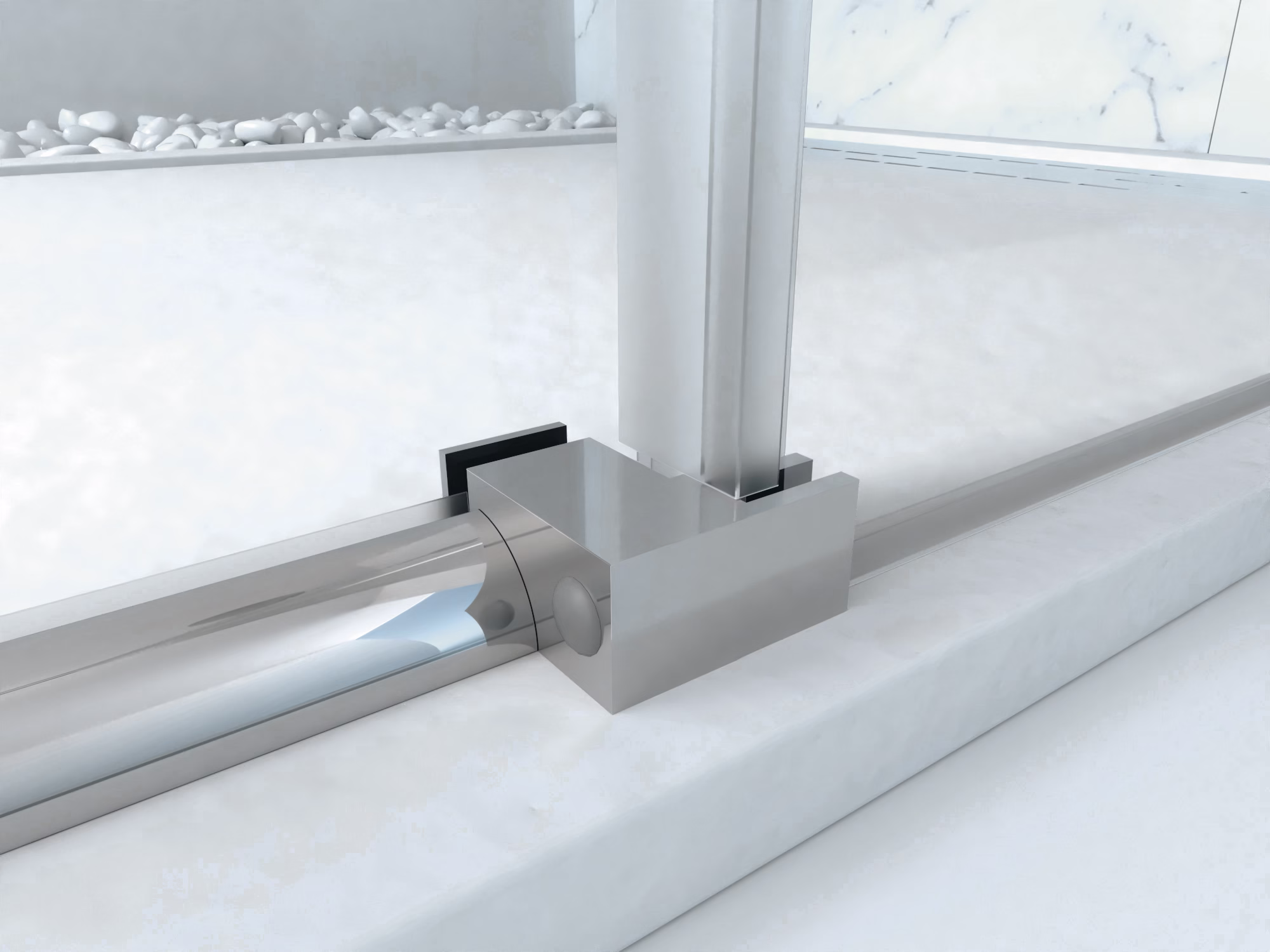 • Guía superior suspendida ampliada y reforzada con alta sección. | -Mampara sin perfil guía inferior. |