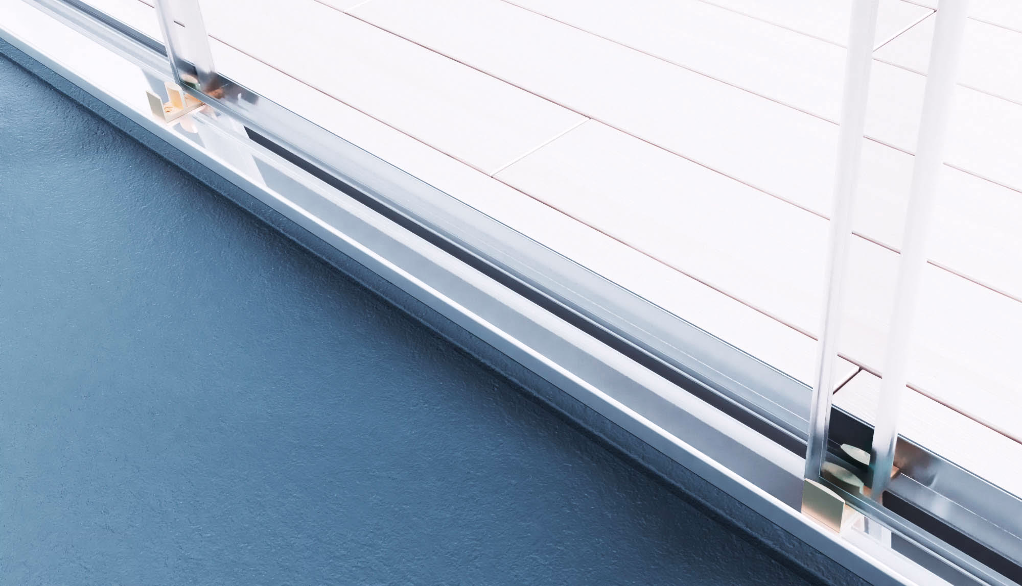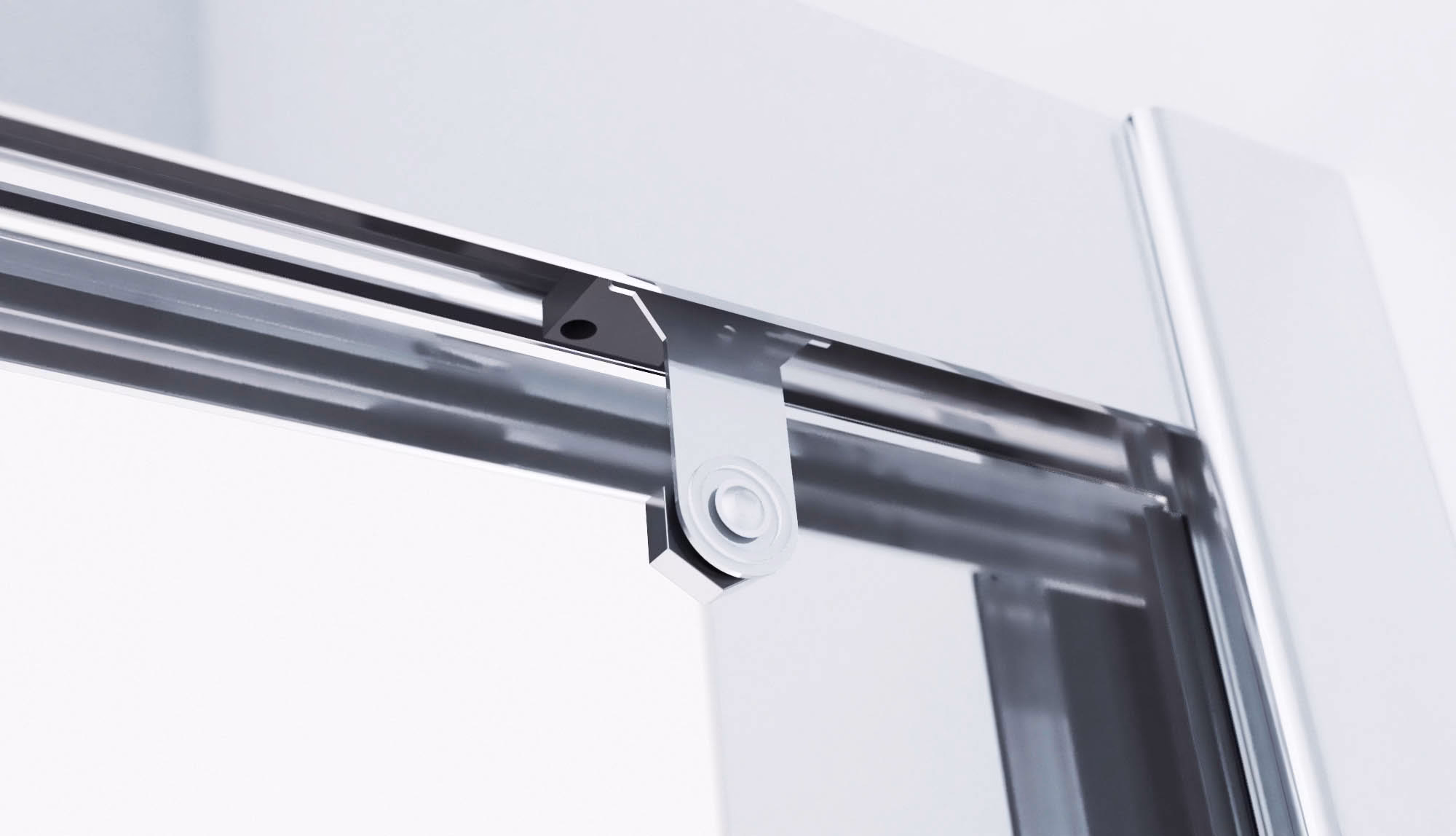 | • Rodamientos ocultos con cuerpo soporte de doble támdem en acero inoxidable. Y regulación en altura por excentrica. | • Mampara con perfil guía inferior. |